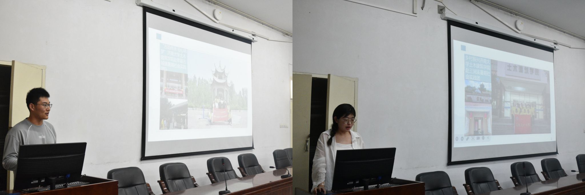 活动邀请了暑期社会实践优秀学生代表,分享团队和自己在实践过程中的所见所闻和所学所得。“古韵传承·砼心筑梦”团队跟随指导老师前往山东聊城莘县对古城镇文化进行深入挖掘与研究,结合“文化挖掘+项目建筑设计”的理念开展反复调研及资料收集,用时1个月的时间作出秦皇古堤纪念堤设计方案,得到镇政府和莘县博物馆的高度好评。“重走梁林路”团队沿着梁思成、林徽因等建筑大师足迹,前往山西省六市县深入观察与记录古建筑的历史脉络、建筑美学及保护现状,更加坚定了他们传承与发扬中华文化的信念与决心。“基层服务”实践团队通过集中和分散实践,在街道等地开展防诈骗安全教育、廉洁政策宣讲、环境治理等,用实际行动践行社会责任,为基层群众送去温暖与帮助;在乡村校园里,队员们组织丰富多彩的课外活动,激发孩子们对知识的渴望和对未来的憧憬,团队成员深感教育的力量。活动在一片热烈的掌声中圆满结束。同学们纷纷表示,通过这次社会实践优秀学生代表的分享,他们不仅开阔了视野,更深刻地认识到了作为当代大学生的责任与使命。未来,他们也将积极参与社会实践,为社会的发展贡献自己的力量。