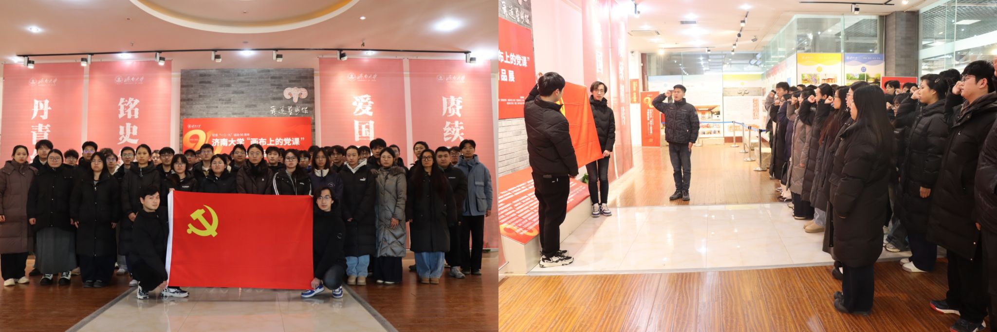 首先,全体新发展党员共同参观了纪念“一二·九”运动90周年“画布上的党课”书画精品展。展览共分为“山河危局·历史回响”“精神永续·青春向上”“砥砺奋进·自信自强”三个单元,通过艺术叙事串联“一二·九”运动历史场景、爱国主义精神传承脉络及新时代中国式现代化建设实践,让新发展党员直观感悟革命先辈矢志报国的家国情怀。