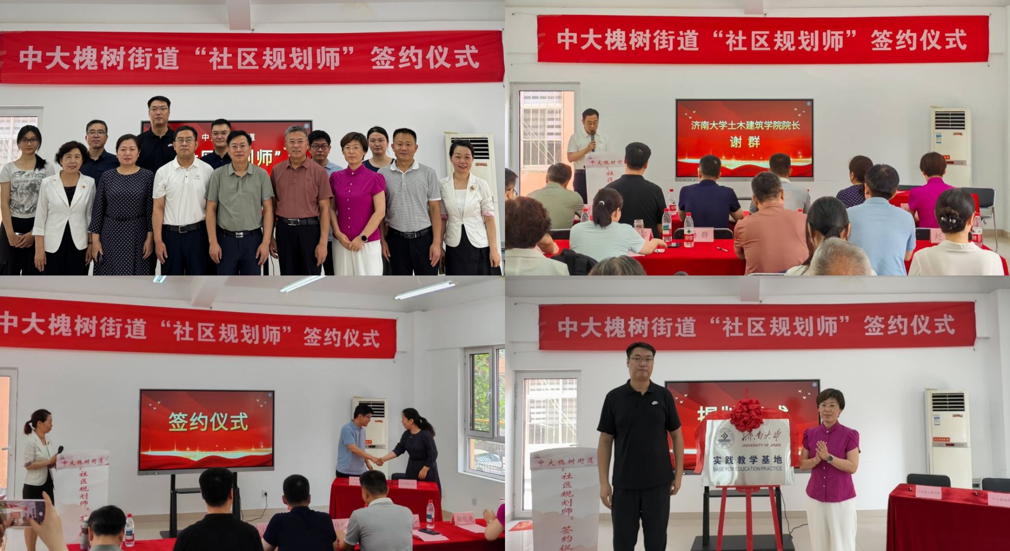 我院副院长杨涛春与中大槐树街道办事处主任王洁签署合作协议。学校教务处副处长郝晓艳与槐荫区融媒体中心副主任刘鹏共同为“本科实践教学基地”揭牌。槐荫区委组织部副部长杨振宇与槐荫区委社会工作部副部长刘浦为“社区规划师实践基地”揭牌。