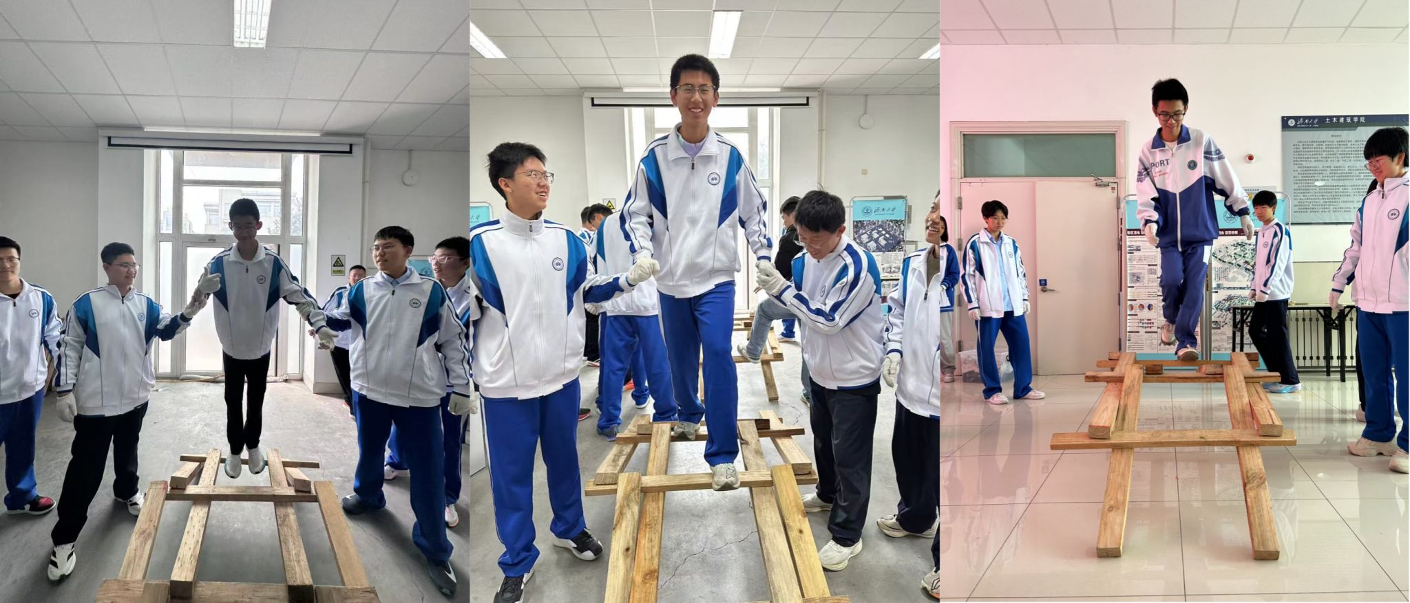 在土木工程综合实验楼大厅,57名同学进行《清明上河图》中大虹桥搭建的实践,还参加了搭建比赛。同学们积极讨论与互相协助,当最后一根的木杆稳稳卡入拱架,无需一根钉子的虹桥模型终于撑起自己重量时,同学们体验到了“工匠精神”。