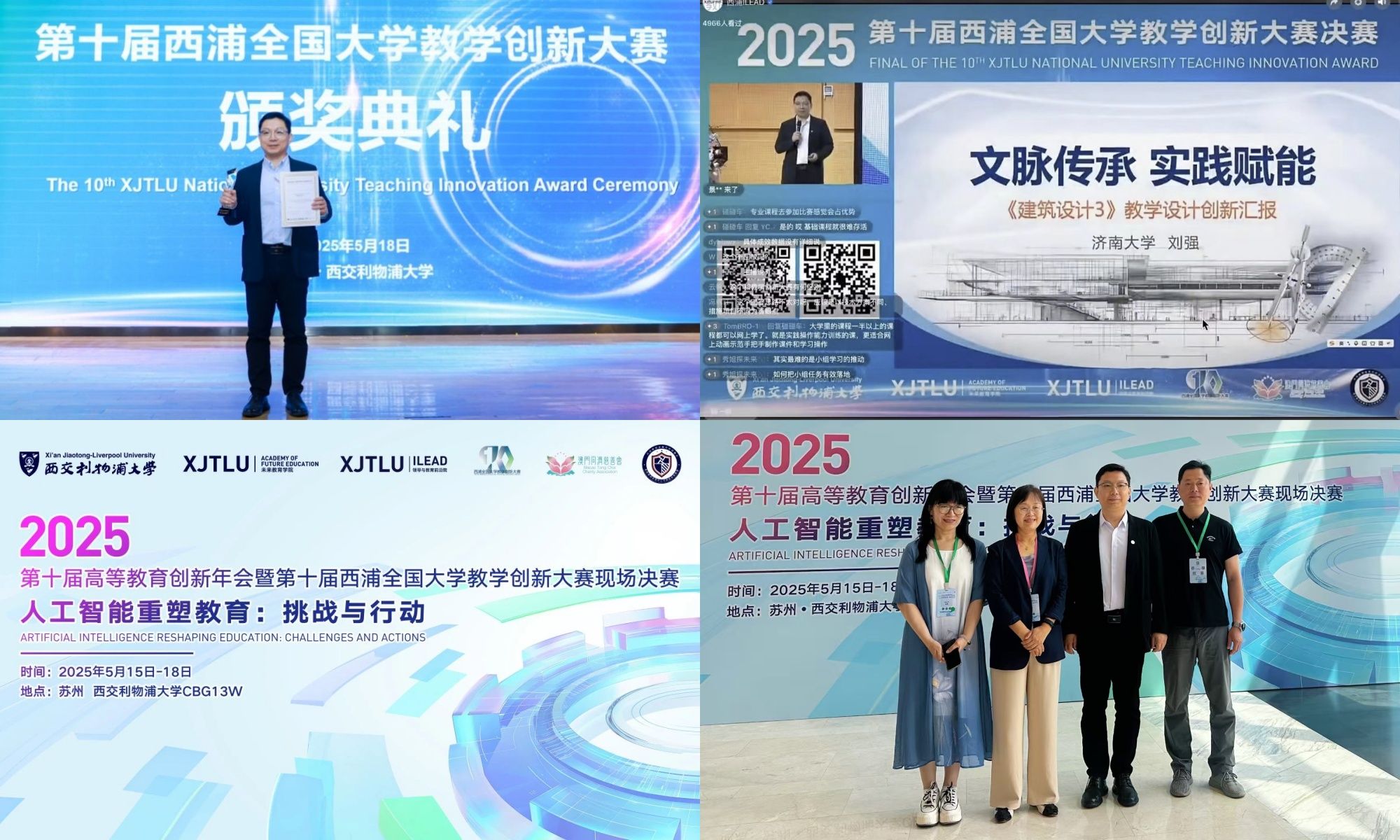 5月17日至18日,第十届西浦全国大学教学创新大赛在西交利物浦大学举办,我院刘强教授团队以《文脉传承、实践赋能的〈建筑设计3〉教学创新》获得一等奖。