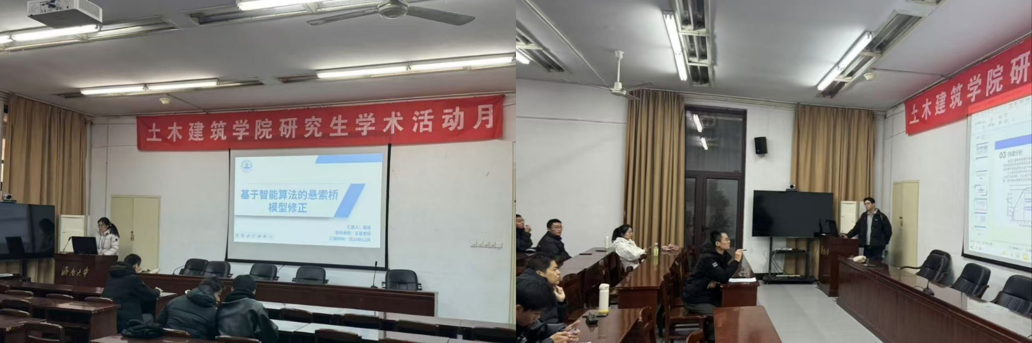 璐瑶以“基于智能算法的悬索桥模型修正”为题,探讨了基于智能算法的悬索桥模型修正方法,对悬索桥有限元模型的关键参数进行识别与修正,以提高模型的准确性与可靠性;杨可新以“考虑设施失效风险与交通拥堵条件下应急疏散设施选址与服务分配优化研究”为题,通过数学建模、算法设计与实例分析,深入探讨了如何在不确定性和复杂交通环境下确定最优的设施布局和服务分配方案,以最大程度提高应急疏散效率;罗杰波以“硅灰和水泥对免蒸压加气混凝土性能的影响及微观分析”为题,研究硅灰和水泥在免蒸压加气混凝土中的应用,深入理解材料性能变化的本质,为免蒸压加气混凝土的优化提供理论依据。
