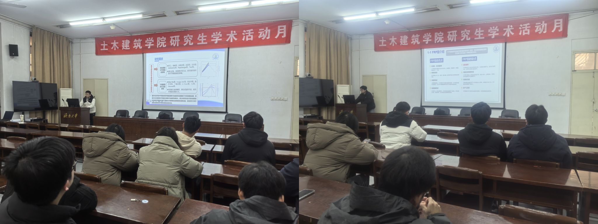 董峰吉以“节理填充厚度对卸载诱发花岗岩滑移行为的试验研究”为题通过专门设计的岩石力学试验装置,对含有不同填充厚度节理的花岗岩试件进行了卸载试验。张洲齐以“基于模糊贝叶斯网络的斜拉桥服役性能评估研究”为题研究确定影响斜拉桥服役性能的关键因素,构建评估指标体系,并采用模糊集理论处理评估过程中的不确定性信息。然后,基于贝叶斯网络建立各评估指标与斜拉桥服役性能之间的复杂因果关系模型,通过参数学习确定网络节点的条件概率分布。相泰志以“FRP筋在离子侵蚀混凝土中的研究现状与应用”为题阐述了 FRP(纤维增强聚合物)筋在离子侵蚀混凝土中的研究现状,包括腐蚀机理、耐久性、粘结性能和力学性能等方面的研究成果,并探讨了其在海洋工程、桥梁工程、地下工程和水工结构等领域的应用情况。