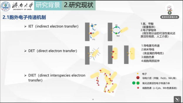 黄清铃同学以电活性微生物为研究载体,介绍了胞外呼吸与传统呼吸的区别。通过对微生物胞外电子传递机制,黄清铃同学向大家展示了电子传递效率提高的方法,如纳米材料介导及对微生物进行改造。