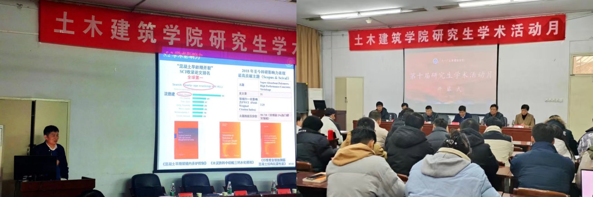 开幕式后沈德建教授作了题为《低碳高耐久混凝土结构研究》的学术报告。报告中,沈教授首先提出了混凝土中钢筋锈蚀导致混凝土结构抗震性能下降的现实背景,然后详细介绍了耐久机理以及在侧边约束条件下、轴向约束条件下的抗裂性能评价方法和锈蚀结构耐久性评价方法,目前最新研究的新型低碳混凝土开发技术,最后,沈教授分享了自己对研究生培养的心得体会,从研究生应该成为什么样的人、应该学习什么以及如何开展研究三方面提出了建议。