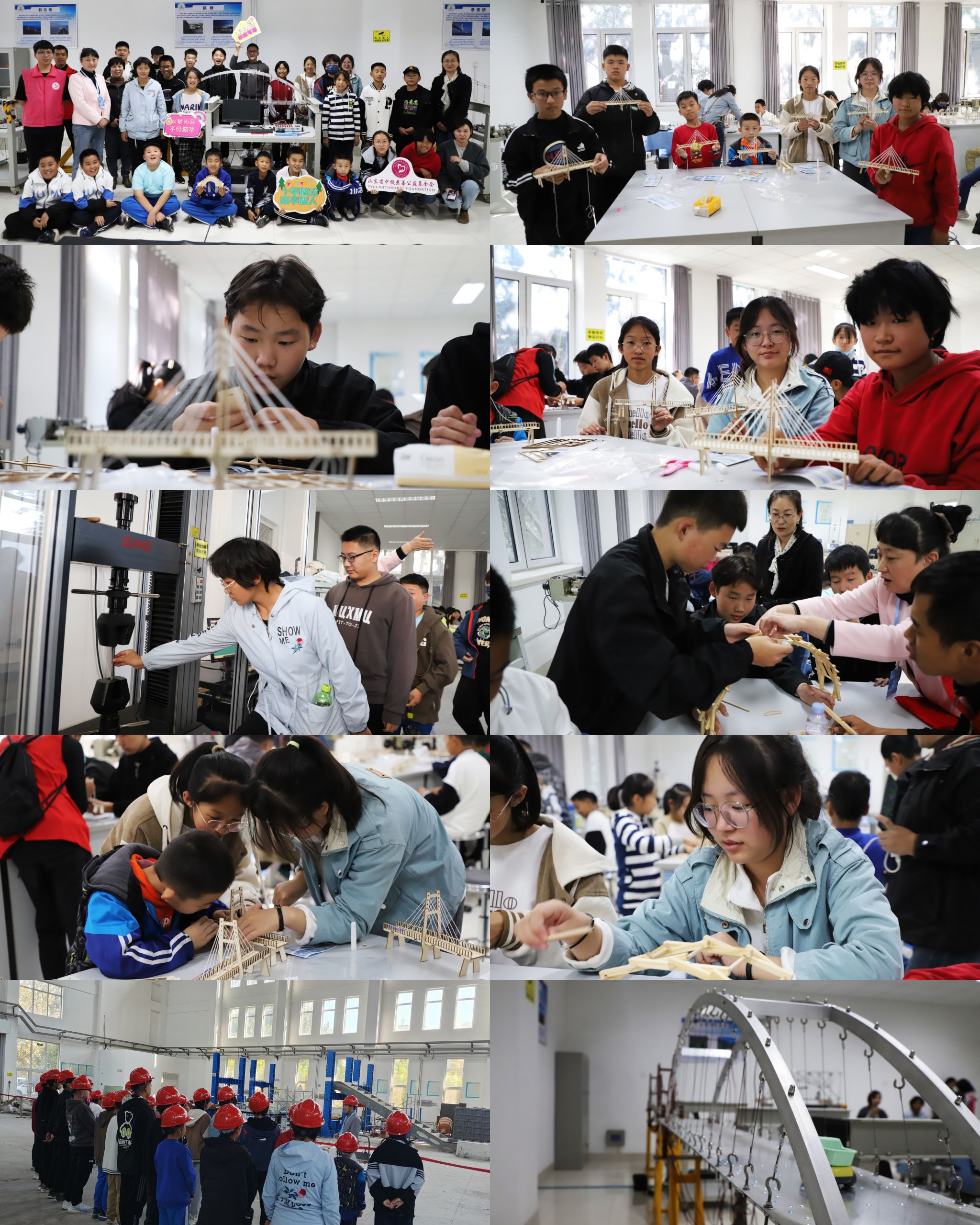 WilliamHill中文实验中心研学实践项目团队的老师们带领学生们在WilliamHill中文实验中心开启了探索实践之旅。在参观体验环节,学院实验中心的老师们在桥梁模型实验室,耐心细致的向学生们讲解桥梁基础知识,贯穿古今的桥梁历史犹如一部画卷在孩子们面前徐徐展开。在结构实验室,学生们体验了1500平米的广阔实验空间,观看了体型巨大的实验设备。并在力学实验室,利用大仪设备开展钢材拉伸实验,感受钢材在破坏过程中形态、颜色和热量变化。在动手实践环节中,同学们认真地听了老师们对斜拉桥、倍力桥基础原理与建设的讲解后,自己动手制作斜拉桥和倍力桥模型,感受到了建筑智慧,也培养了学生们精益求精、锲而不舍的工匠精神。