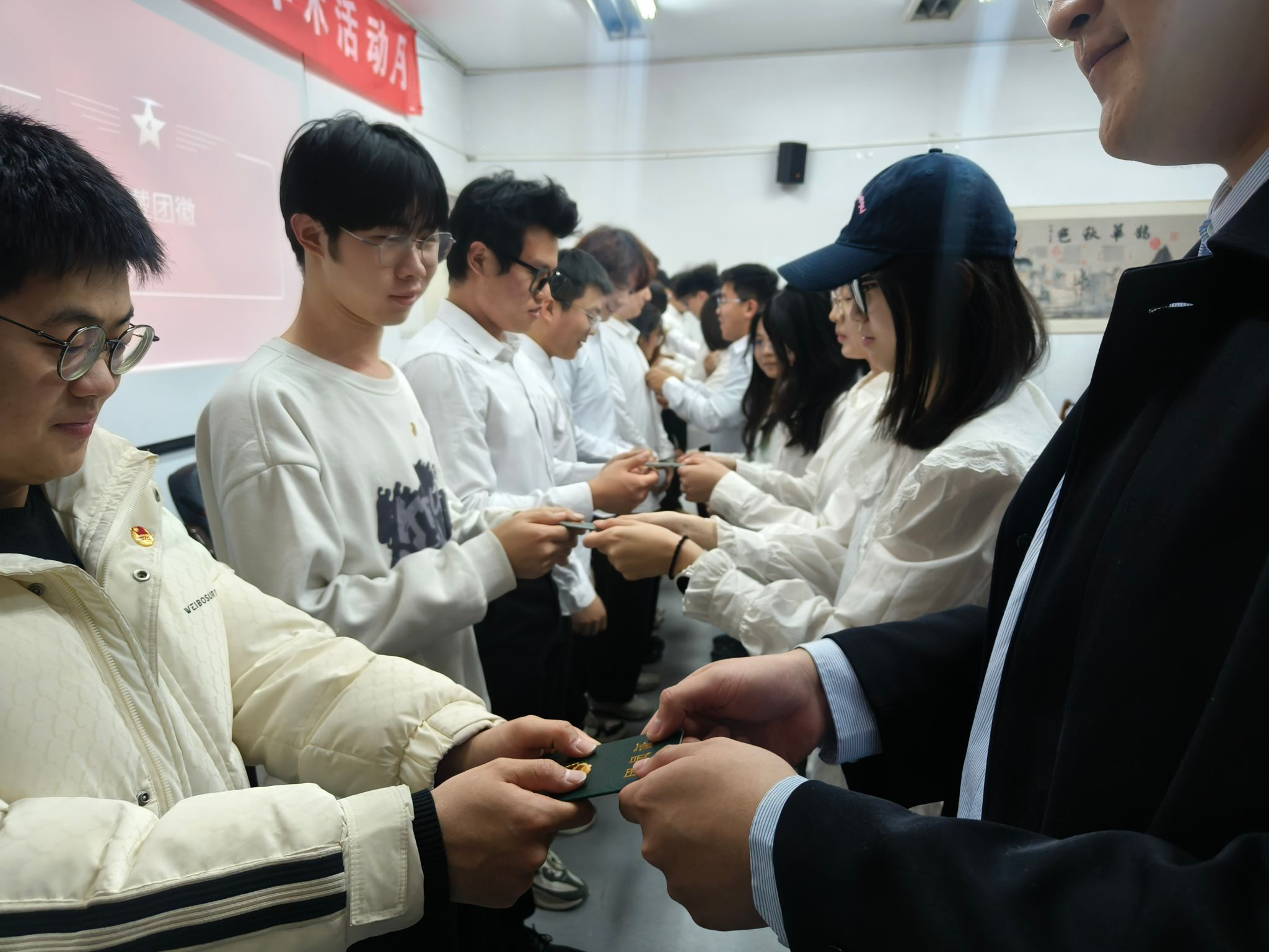 仪式在庄严肃穆的氛围中开启,全体同学整齐肃立,奏响中华人民共和国国歌。那激昂的音乐,唤起了在场每一位青年学子内心深处的爱国热忱与民族自豪感,为入团仪式奠定了神圣而庄重的基调。团总支王姝文同学宣读了2025年下半年新团员名单,团干部为新团员颁发团徽与团员证。崭新的团徽在灯光下熠熠生辉,当它被佩戴在新团员的胸前时,不仅是一份荣誉的象征,更是一份沉甸甸的责任与使命的赋予。新团员们双手接过团员证,眼神中满是对未来的憧憬与坚定信念。