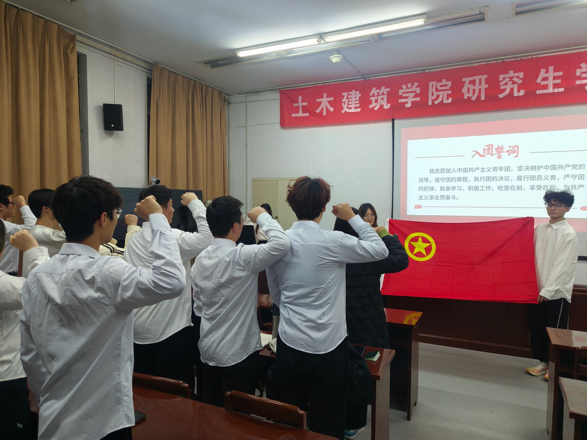 在团组织代表的带领下,新团员们面向团旗,举起右拳,庄严宣誓。“我志愿加入中国共产主义青年团,坚决拥护中国共产党的领导。”誓言铮铮,回荡在报告厅上空,这是新团员们对共青团的忠诚承诺,是他们青春路上的嘹亮号角,宣告着他们将以共产主义事业为奋斗目标,砥砺前行,永不退缩。