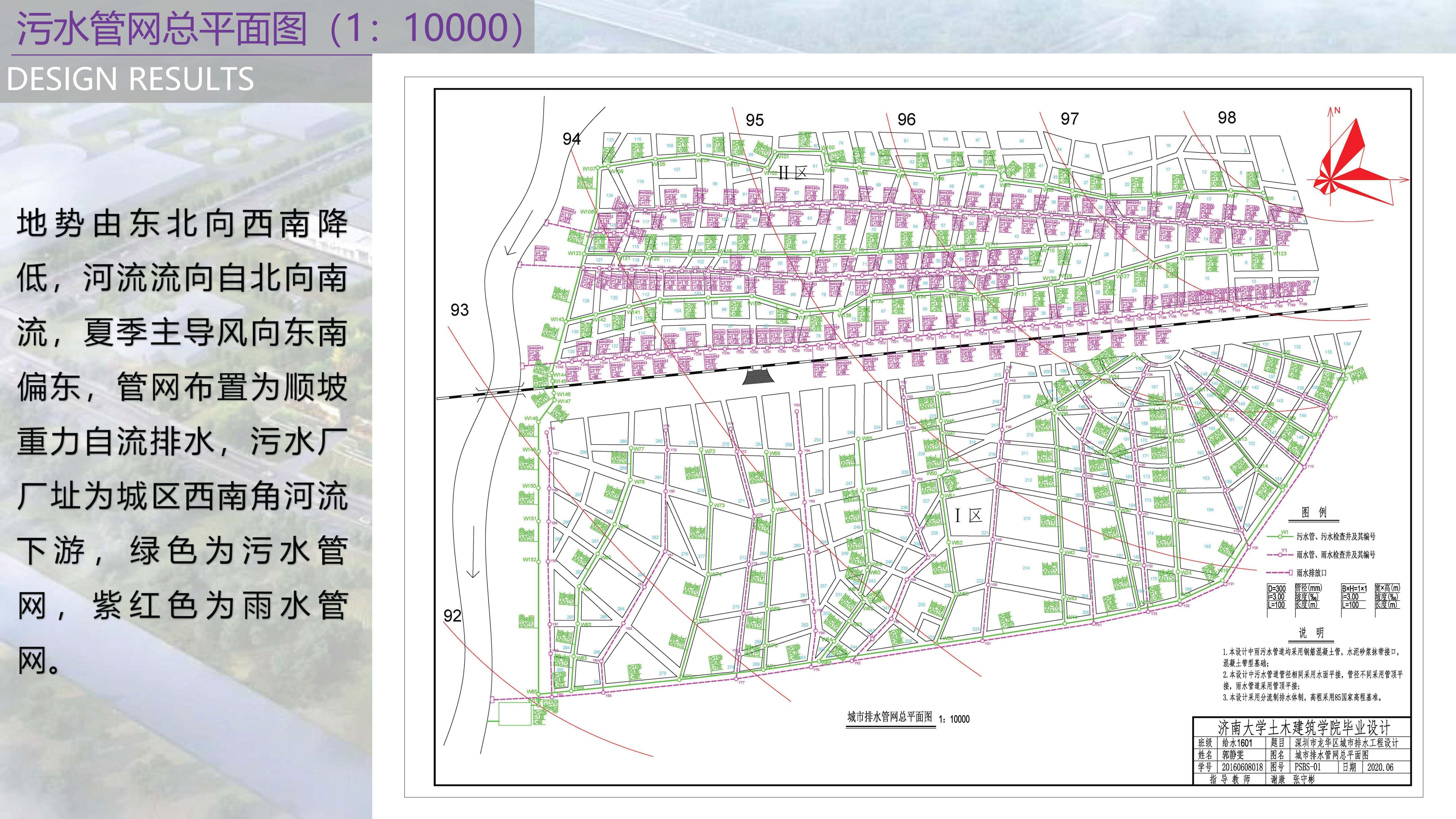 设计内容:本设计为深圳市龙华区城市排水工程设计,主要进行城市排水管网设计及污水处理厂设计。设计区域位于深圳市龙华区,主要由住宅区和工厂组成,年平均气温22℃,常年主导风向为东南偏东。龙华区地面标高由东北向西南逐渐降低,河流位于城区西侧,自北向南流。铁路为东西走向并将该规划区分为Ⅰ、Ⅱ两个区。设计采用完全分流制排水系统,雨水直接排河而污水处理后排河。