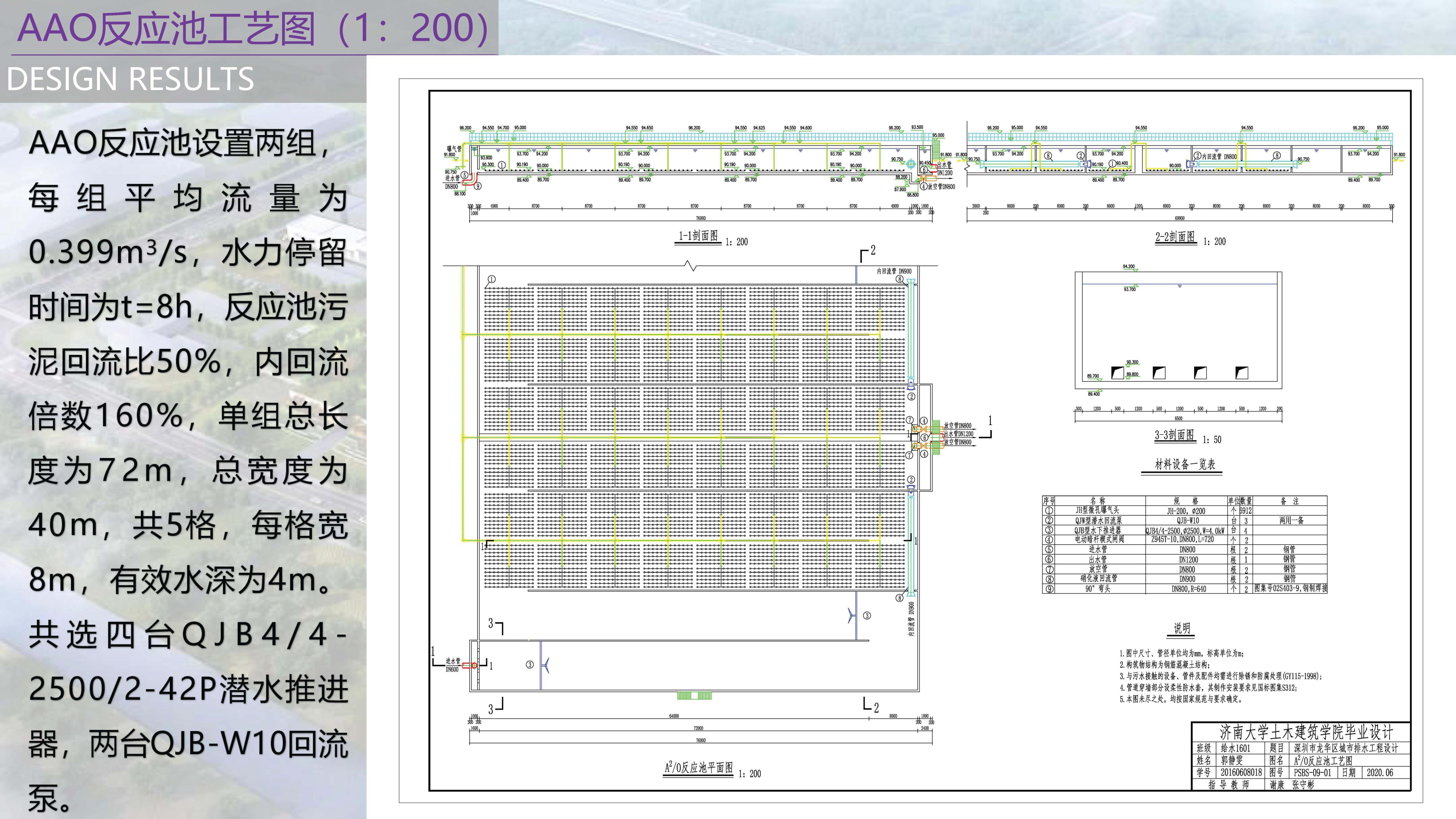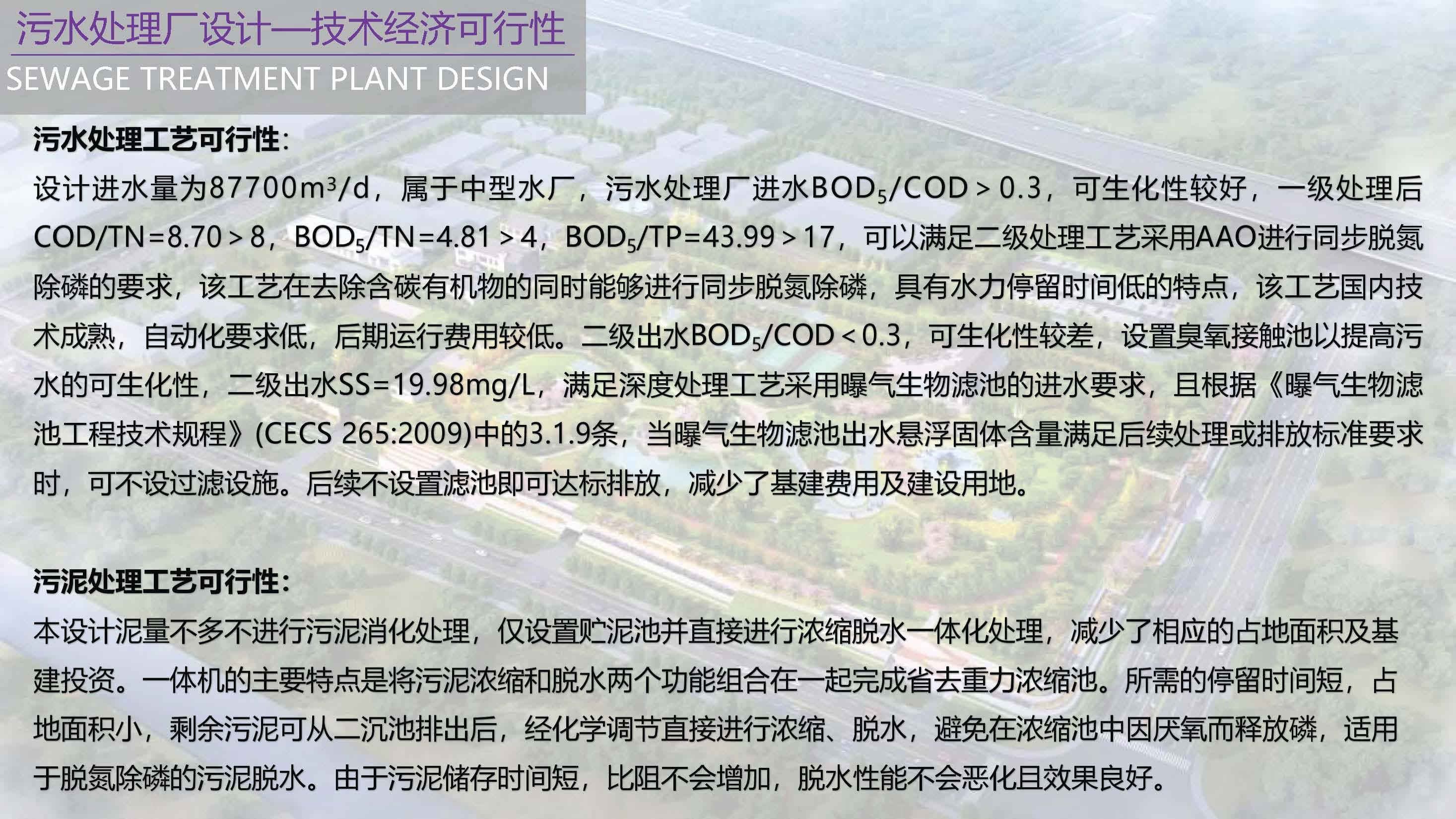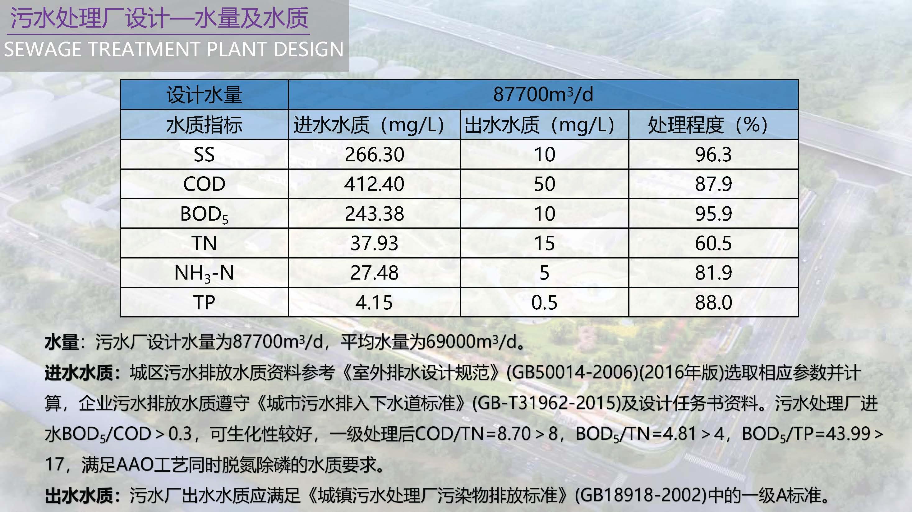 污水厂最大日设计污水量87700m3/d。设计污水进水水质为:SS=266.30mg/L,COD=412.40mg/L,BOD5=243.38mg/L,TN=37.93mg/L,NH3-N=27.48mg/L,TP=4.15mg/L。经处理达到国家污水排放标准一级A标准后排放。