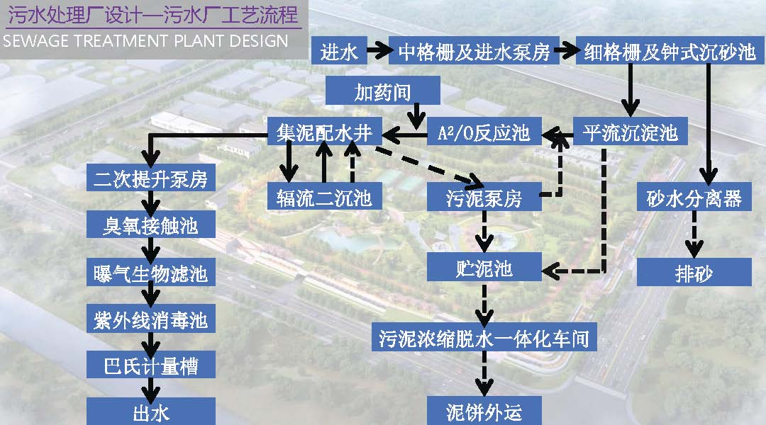 污水处理核心工艺采用“A2/O艺+BAF工艺”。主体工艺A2/O在处理有机碳污染物的同时可以实现同步脱氮除磷,相较于传统活性污泥法的优势有投资少、运行费用低及化学污泥少等优点。由于本设计中二级处理出水可生化性能一般,需在深度处理工艺前设置臭氧预氧化池借以提高污水的可生化性能。深度处理工艺采用BAF工艺,该工艺集生物氧化和截留悬浮固体于一体,水力负荷大,运行能耗低且后续无需设置滤池即可达标排放,节省了相应的占地面积及基建投资。本设计的污泥处置采用污泥回流泵房、贮泥池及污泥浓缩脱水设备进行一体化处理。